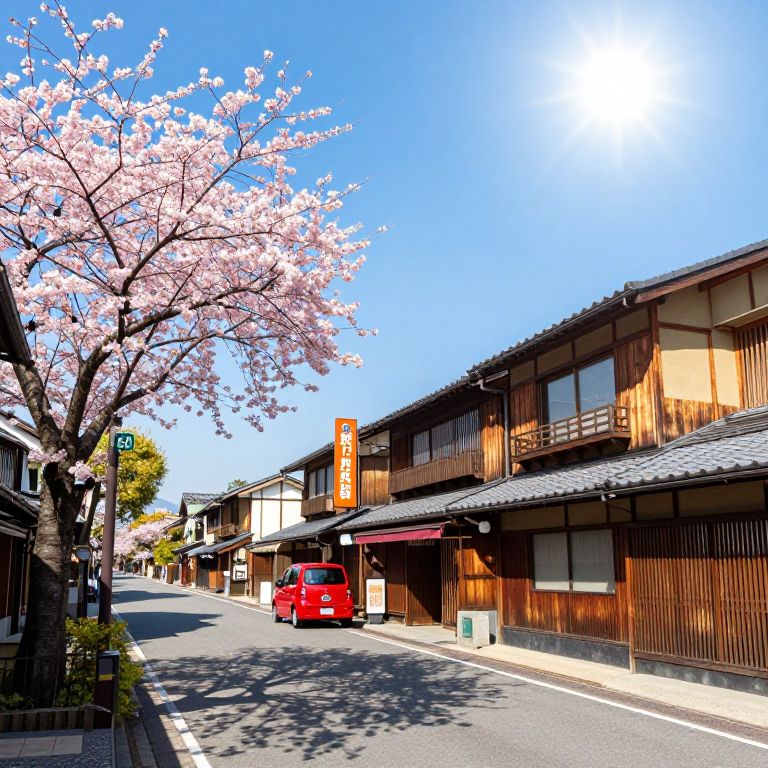 The image depicts a vibrant, sunny day in Japan, with a clear blue sky and a bright sun shining overhead. The scene is set in a traditional Japanese neighborhood, characterized by wooden buildings with sloped roofs and intricate architectural details. A cherry blossom tree, adorned with pink and white blossoms, stands prominently on the left, casting delicate shadows on the ground. The street is lined with various shops and signs, including a bright orange sign with white text and a green street sign displaying the number 60. A red car is parked on the side of the street, adding a pop of color to the scene. The overall composition is balanced, with the buildings and trees creating a harmonious visual rhythm. The interplay of light and shadow, along with the warm colors of the buildings and the cool tones of the sky, creates a serene and inviting atmosphere.