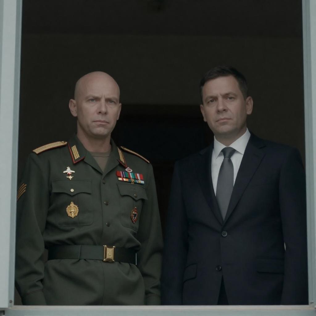 Photograph of two men standing side by side in a dimly lit window. The man on the left wears a dark green military uniform with numerous medals, bald, and has a serious expression. The man on the right wears a dark suit, white shirt, and gray tie, with short dark hair and a neutral expression. The background is dark and indistinct.