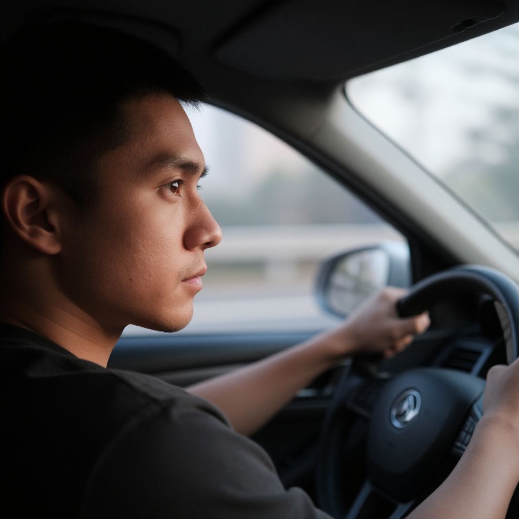 [[man,driving picture]]Captivating candid shot of a man behind the wheel, eyes fixed on the road ahead, fingers gripping the steering wheel, as the urban landscape whizzes by in blurred motion, soft morning light casting a warm glow across his determined face, captured with an iPhone's unobtrusive lens, capturing life's fleeting moments. Man has masculine face and piercing eyes