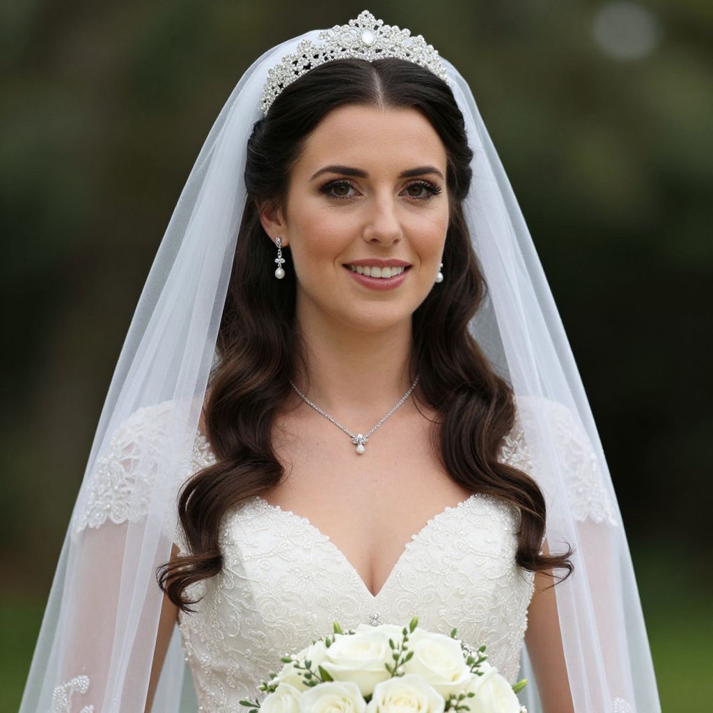 Photograph of a smiling bride with long, wavy dark brown hair, wearing a white lace tiara, veil, and a low-cut, lace-embellished white wedding dress. She has fair skin, dark eyes, and is adorned with elegant drop earrings and a delicate necklace with a small pendant. She holds a bouquet of white flowers. The background is a blurred, green outdoor setting, suggesting a garden or park. The image focuses on the bride from the waist up, with soft, natural lighting highlighting her features.