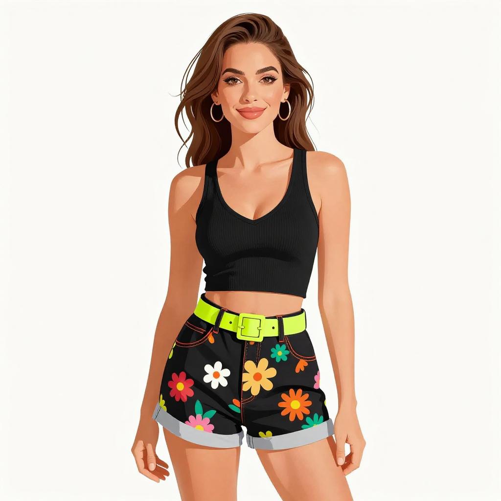 Woman with pretty face and pretty hair. smiling Woman, casual, blue and white plaid button-down shirt, roll-up sleeves, front pockets, distressed denim shorts with frayed hem, dark wash, layered necklaces, natural makeup, loose wavy hair. --sref 1467