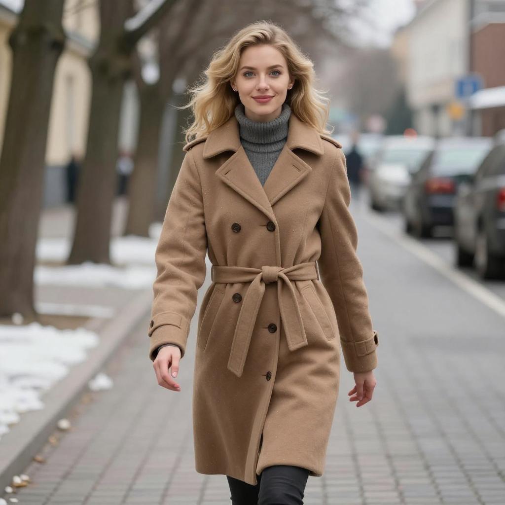 Realistic photo.beautiful Russian girl aged 24 in winter coat walking towards the camera, with blonde hair, piercing blue eyes, lovely smile, complementary color palette, photorealistic, 35mm, octane render, trending on ArtStation realistic photo