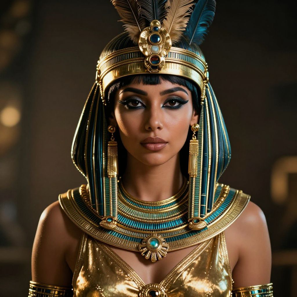 Photograph of a woman with dark skin and striking makeup, adorned in an ancient Egyptian-inspired outfit. She wears a golden headpiece with blue and black striped sides, feathered accents, and a central turquoise gem. Her black bob haircut is framed by the headpiece. She has bold, dark eye makeup and full lips. She wears a matching golden top with intricate designs and a large turquoise necklace with gold accents. The background is dimly lit, focusing attention on her regal appearance. The overall style is highly detailed and richly colored, evoking ancient Egyptian elegance.