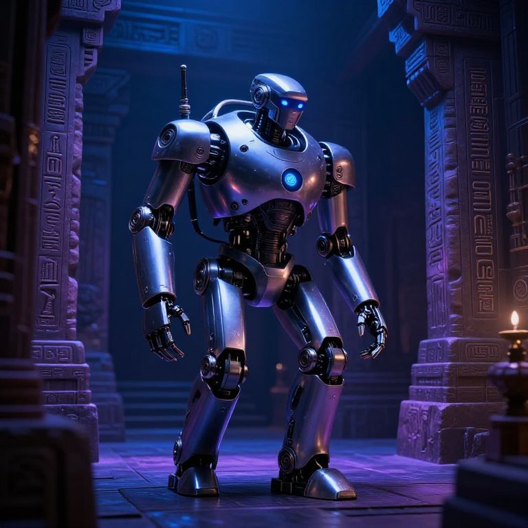 Photorealistic CGI of a shiny, blue-lit, humanoid robot standing in a dimly lit, ancient temple hallway with purple and blue lights.