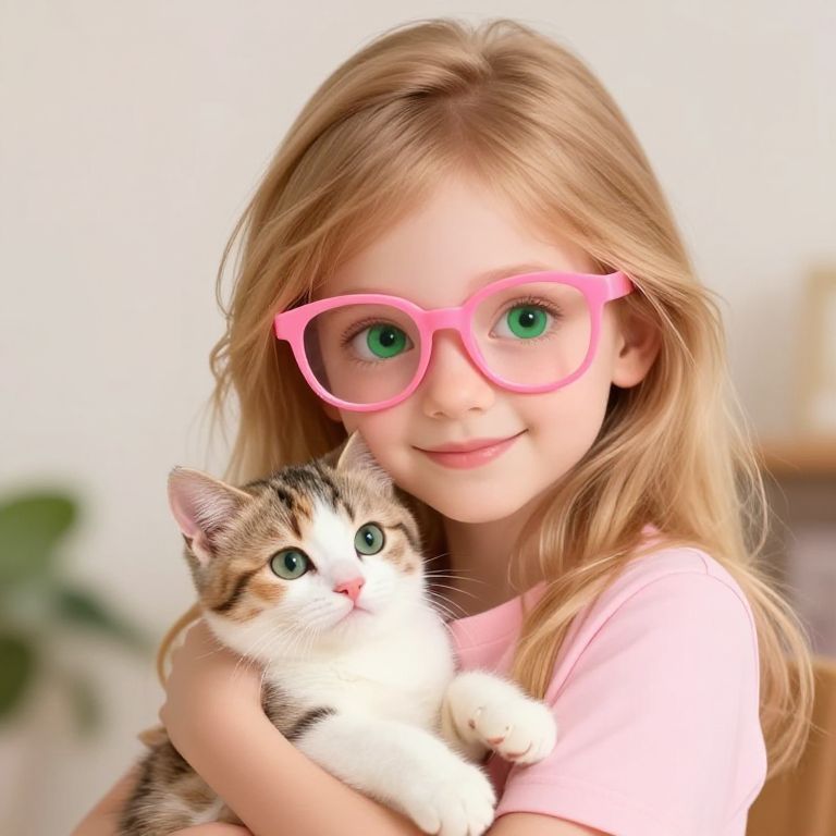 Full-Color young smiling girl with light blond hair, green eyes and pink glases holds sweet kitten in her hands - Upscaled by,