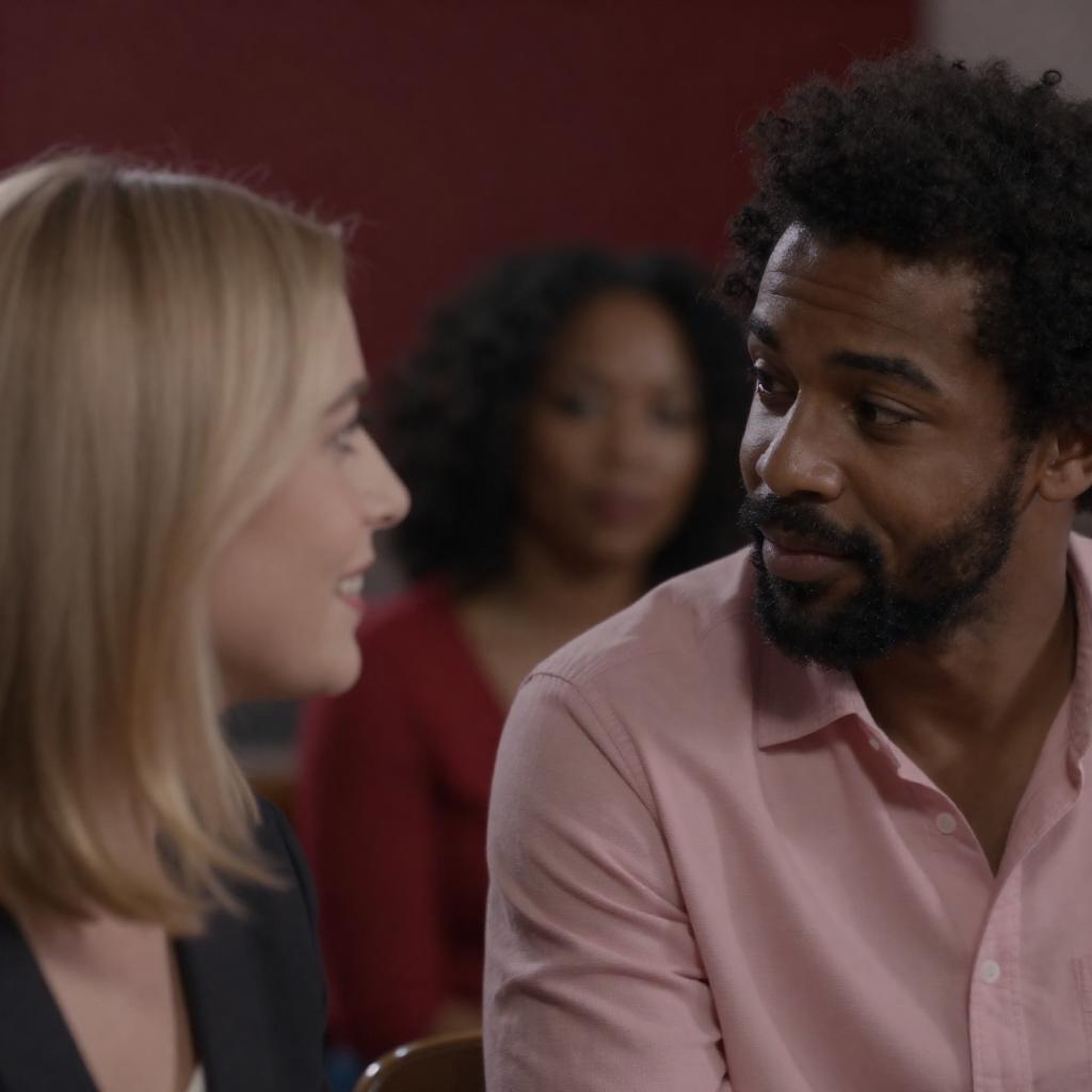 Photograph of three people in a cluttered room with collage-covered walls. A black woman with tattoos and shoulder-length hair, wearing a white top and black shorts, stands talking to a bearded shirtless man with medium-length hair. A blonde woman in a red dress sits on a couch, holding a drink. Table with bottles and drinks in front. Warm, dim lighting. The black woman and shirtless man face each other, while the blonde woman looks at them. Casual, relaxed atmosphere.