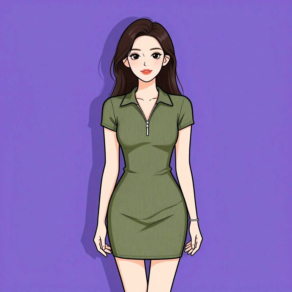 Woman with pretty face and pretty hair. Woman, business casual, olive green suit, single-button blazer, notched lapels, slim-fit design, matching straight-leg trousers, crisp white blouse, collar slightly exposed, plain background. --sref 1467