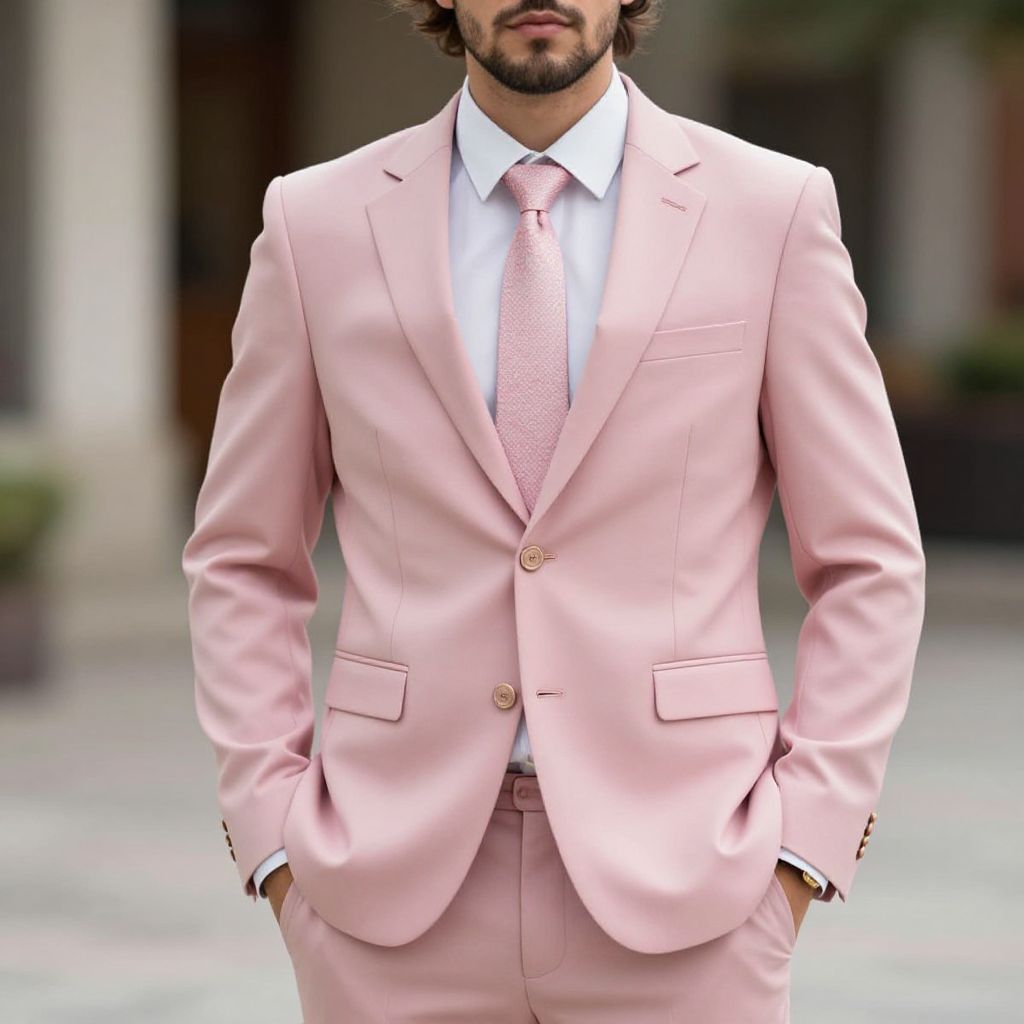 Pink colour suit man, 1boy, male focus, necktie, solo, flower, suit, jacket, facial hair, shirt, pants, brown hair, formal, blurry background, realistic, hands in pockets, pink pants, outdoors, white shirt, blurry, collared shirt, standing, looking at viewer, pink jacket, closed mouth, beard