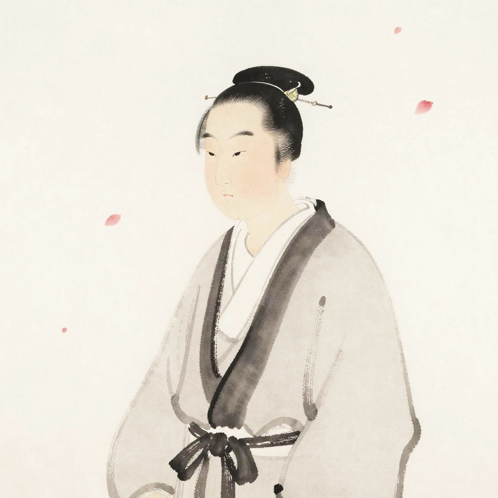 Ikkyu depicted as a minimalist ink painting on rice paper, capturing his thoughtful gaze and simple robes in brush strokes, abstract sakura petals floating gently around, embodying the essence of Zen philosophy and elegance in traditional Japanese art style