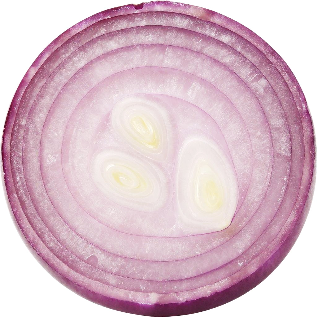Close-up photo of a stack of thinly sliced red onions. The onions have vibrant purple and white layers, with the purple dominating the outer rings and white peeking through the middle. The slices are slightly translucent, showing a smooth, glossy texture. The background is pure white, making the colors of the onions stand out sharply. The image has a soft, almost artistic feel.