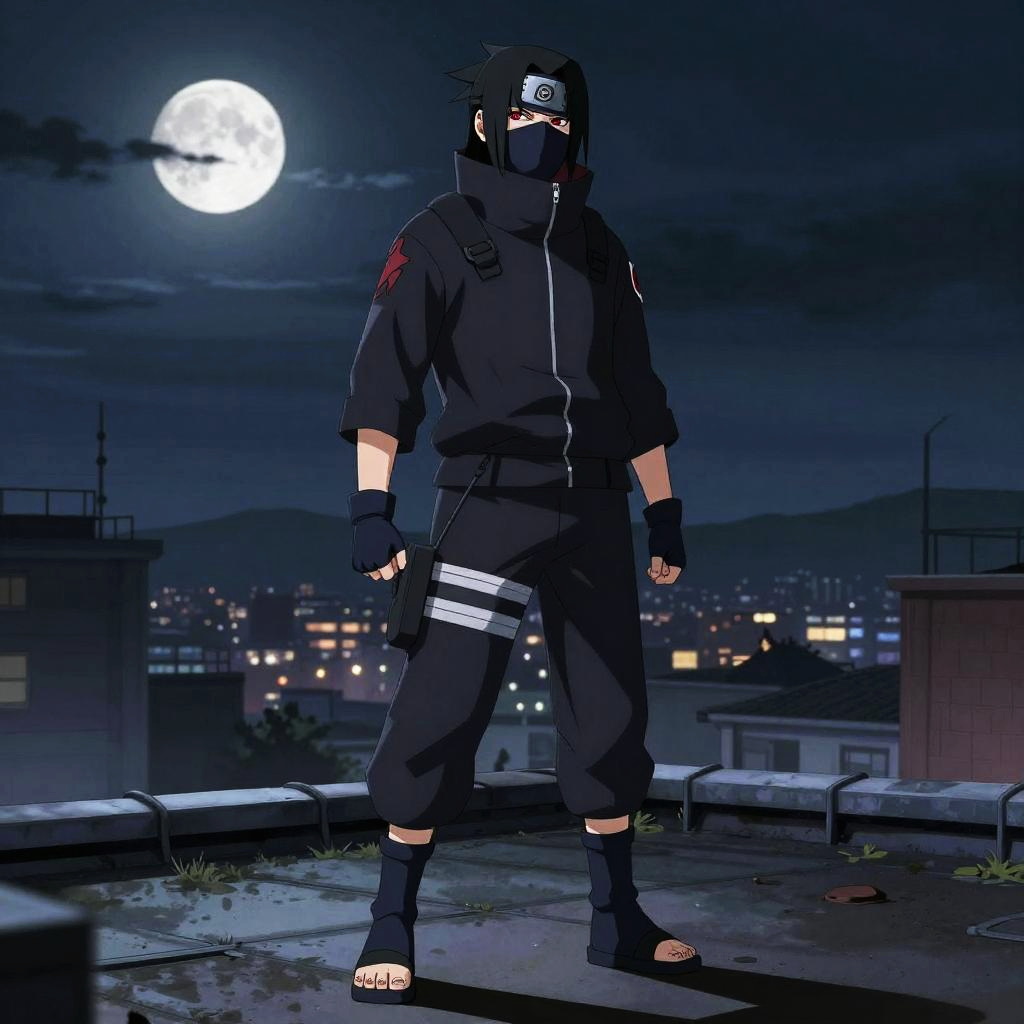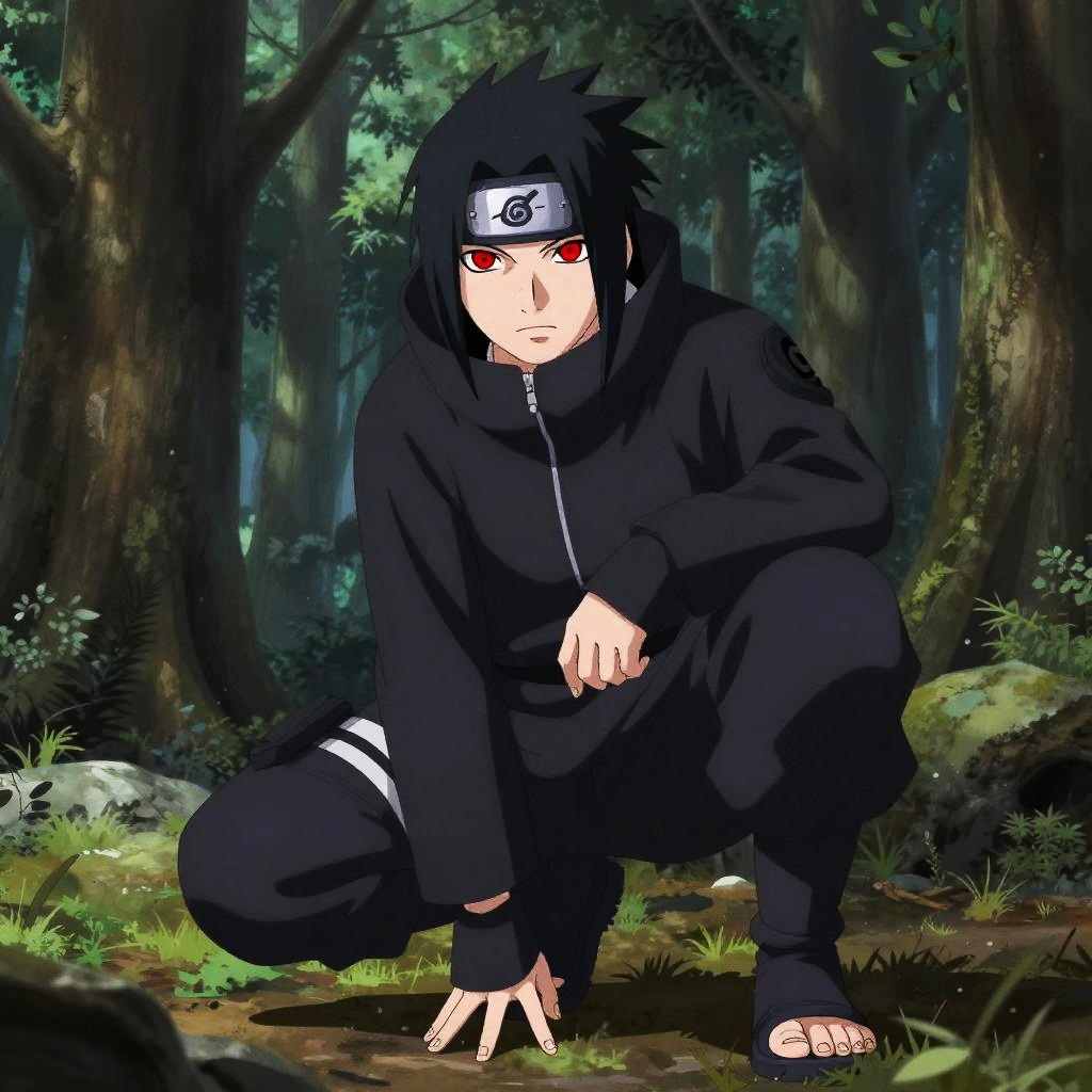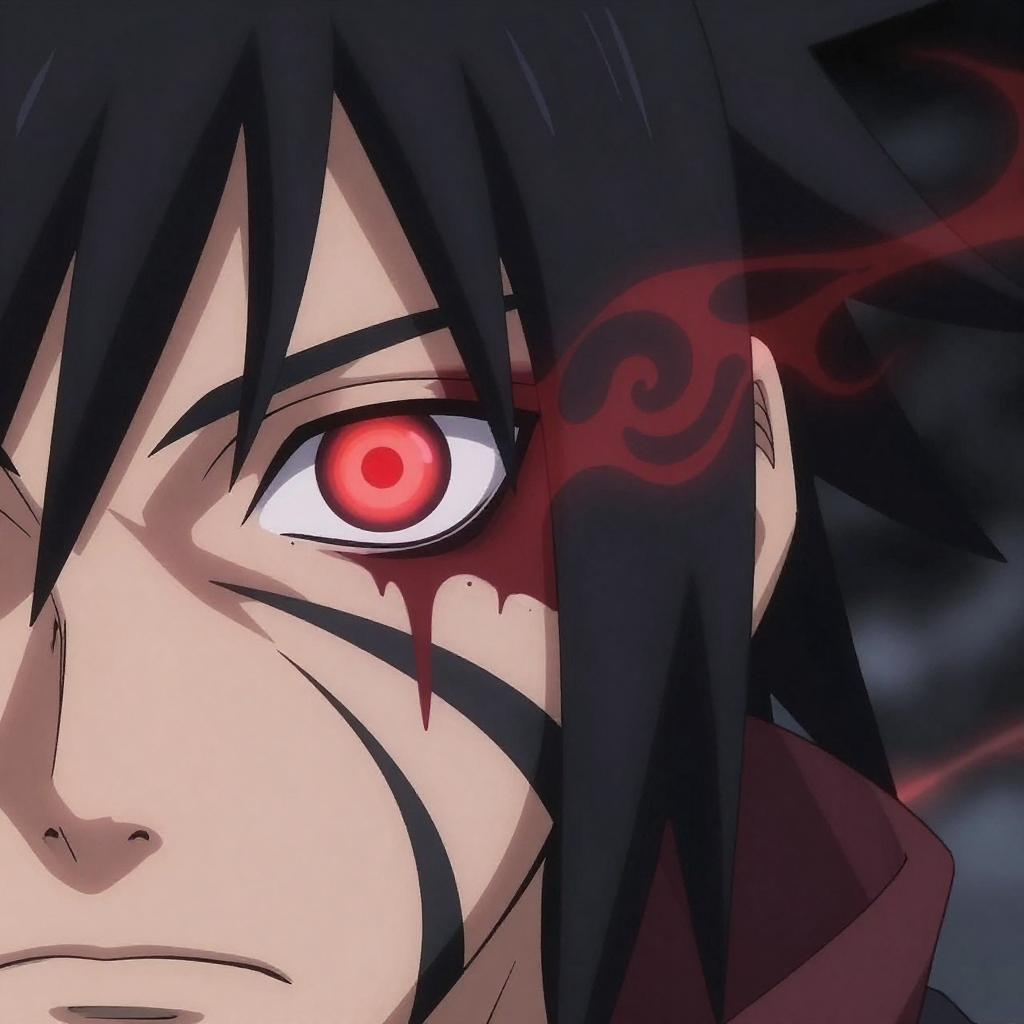 Portrait of Sasuke with curse mark eye glowing ominously, cracked skin effect, shadowy background, intense stare, dynamic energy waves radiating, anime style with vivid color contrast