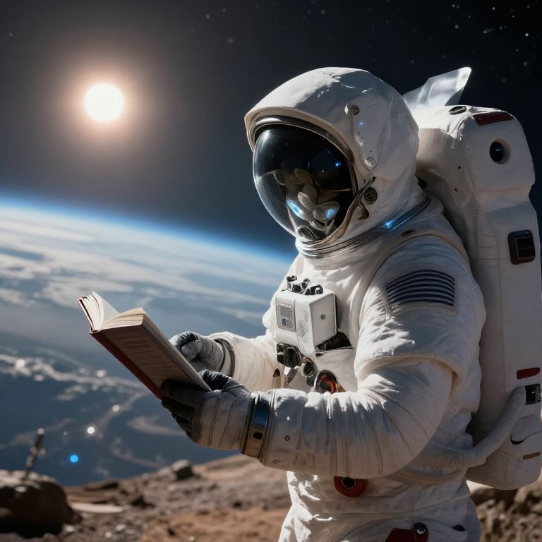 Photorealistic digital image of an astronaut in a white spacesuit, reading a book against a backdrop of Earth's horizon and a bright sun in space