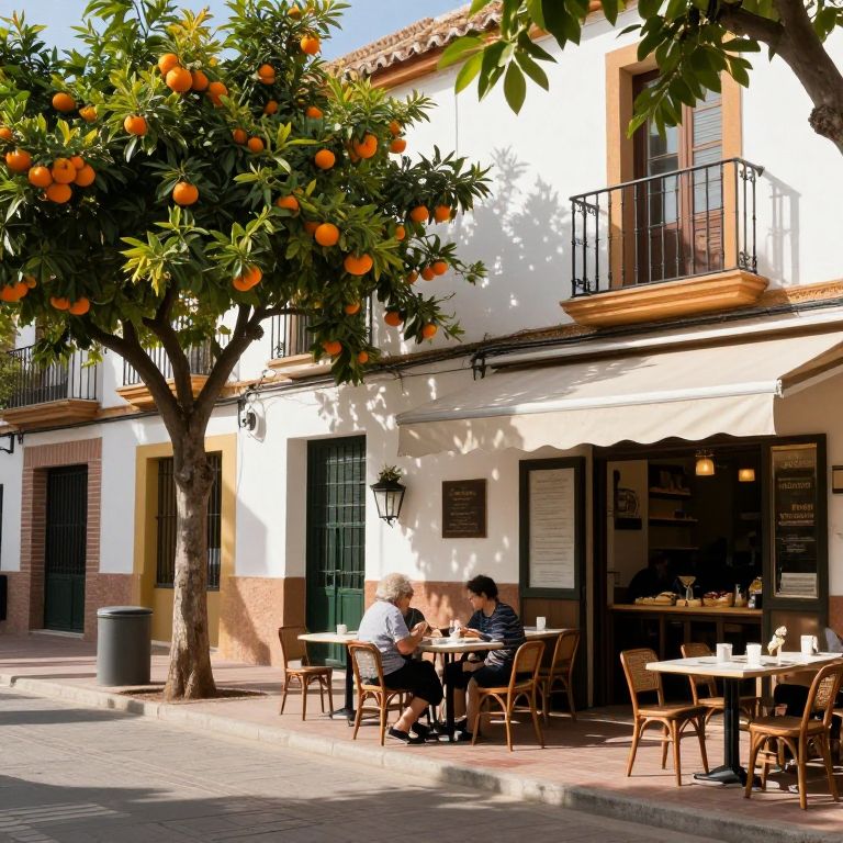 Studio Light hyper realistic, photo, Estepona street, spanish old lady, orange trees, cafe and tapas bar,