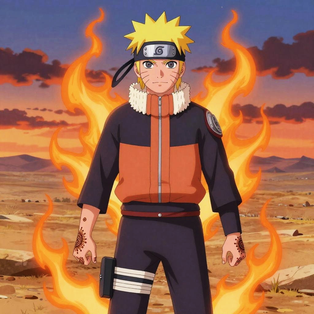 Digital anime-style drawing of Naruto, wearing orange ninja outfit and headband, creating a glowing circular aura in a sunlit, temple courtyard.