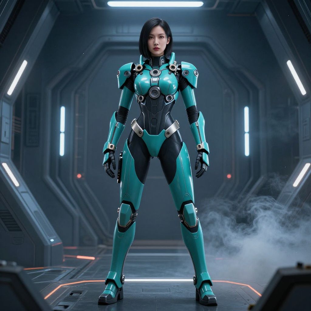 Photorealistic CGI of an Asian woman in teal, high-tech armor standing confidently in a futuristic, dimly lit corridor with glowing lights and mist.