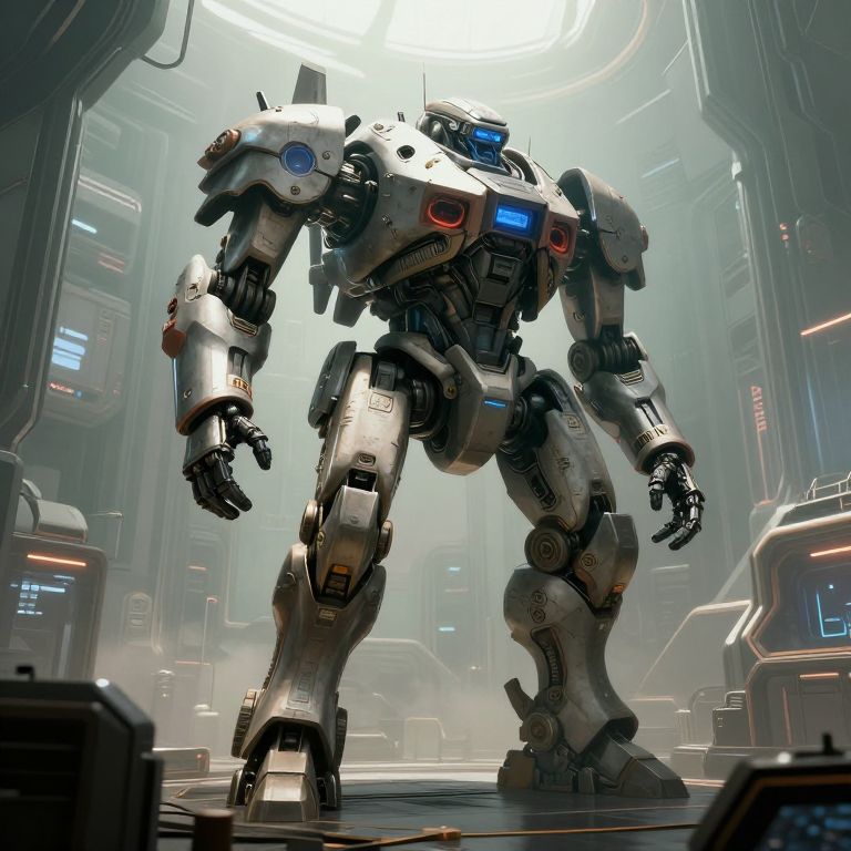 CGI image of a towering, white, humanoid robot with blue and red lights, standing in a futuristic, dimly-lit, sci-fi warehouse