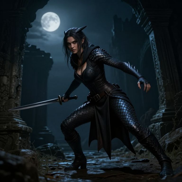 Digital artwork of a fierce, dark-haired woman in black, scaly armor, holding a sword under a full moon in a ruined, ancient temple.