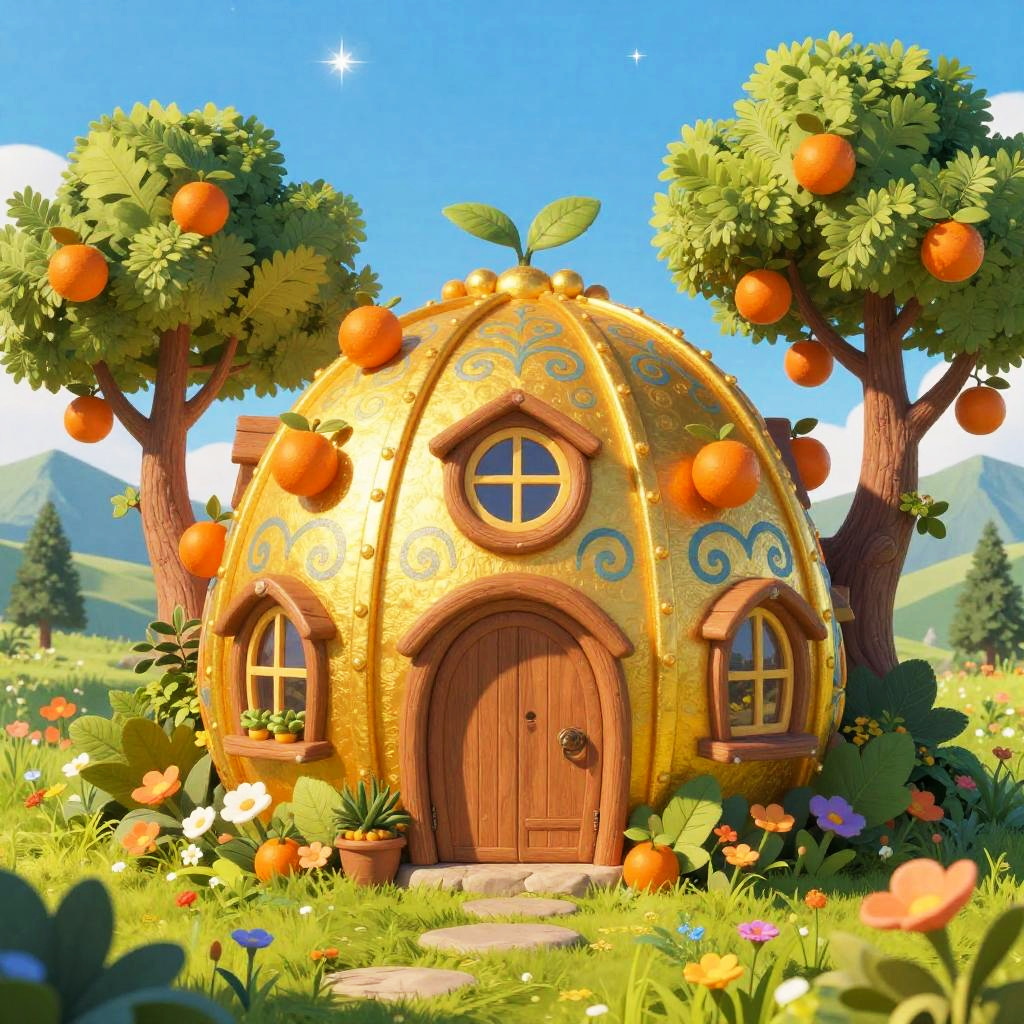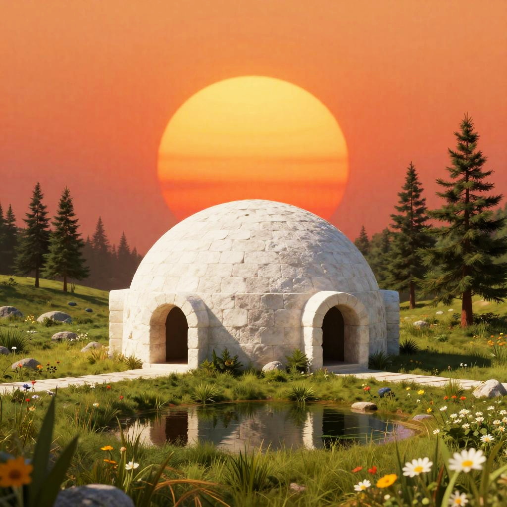 A digital artwork features a white, stone dome with two dark entrances, set in a lush, green meadow with a small pond and scattered wildflowers. A huge, glowing orange-red sun dominates the sky, casting a warm, intense light over the scene. The dome sits slightly off-center, with pine trees flanking it on the right. The overall style is surreal and vibrant.