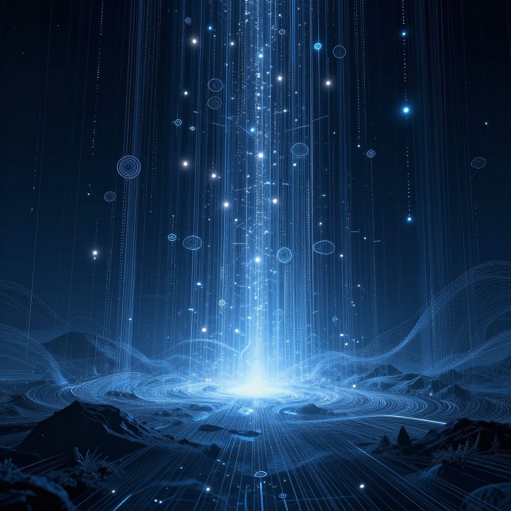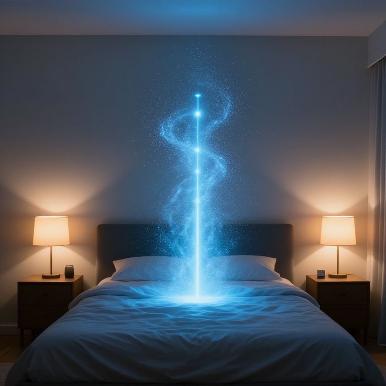 Photograph of a modern bedroom at night. A bed with white sheets and a dark blue headboard is centered against a wall. Two bedside tables, each with a lit lamp, flank the bed. Above the bed, a glowing blue light forms a spiral shape, resembling a light saber or cosmic energy, casting a soft blue hue on the white wall. The room is dimly lit, creating a serene and mystical atmosphere. The lamps emit a warm, yellowish light that contrasts with the cool blue glow of the spiral light.