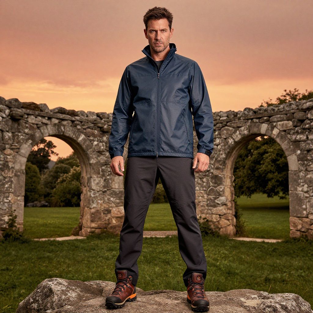 A man, insulated waterproof jacket, thermal base layer, quick-dry hiking pants, sturdy leather hiking boots, dark navy with bright orange details, ancient stone arches, lush green park, vibrant sunset sky, sepia effect, determined expression Man has masculine face and piercing eyes