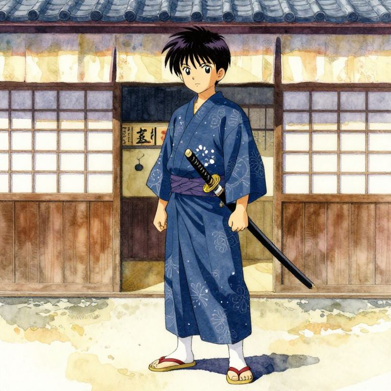 "Batik watercolour art, anime manga style, a boy with long feet, blue kimono, samurai sword, in front of a japanese restaurant,"