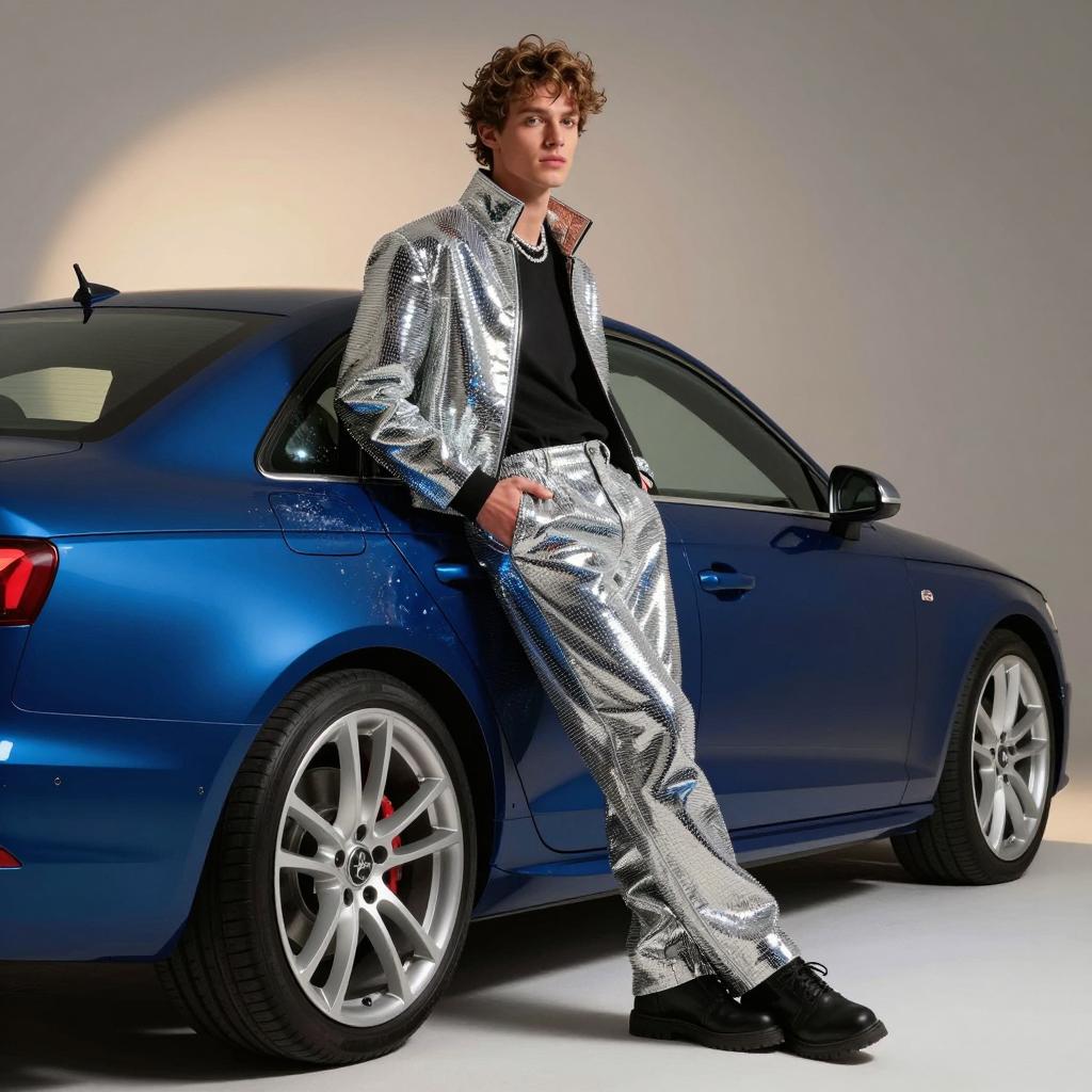 Orchestra a stylish young guy is arriving to retro disco by his sprint blue audi s4 sedan, dinamic pose, detailed hair texture, ornate, sharp focus, in the style of National Geographic, photoportrait, Cinematic, Color Grading, portrait Photography, Ultra-Wide Angle, Depth of Field, hyper-detailed, beautifully color-coded, insane details, intricate details, beautifully color graded, Cinematic , Color Grading, Editorial Photography , Photography, Photoshoot, Shot on 70mm lens, Depth of Field, Shutter Speed 1/1000, F/22, White Balance, 32k, Super-Resolution, Megapixel, Pro Photo RGB , VR , Lonely, Good, Massive, Half rear Lighting, Backlight, Natural Lighting, Incandescent, Optical Fiber, Moody Lighting, Cinematic Lighting, Studio Lighting, Soft Lighting, Volumetric, Conte-Jour, Beautiful Lighting, Accent Lighting, Global Illumination, Screen Space Global Illumination, Ray Tracing Global Illumination, Optics, Scattering, Glowing, Shadows, Rough, Shimmering, Ray Tracing Reflections, Lumen Reflections, Screen Space Reflections, Diffraction Grading, Chromatic Aberration, GB Displacement, Scan Lines, R a y Traced, Ray Tracing Ambient Occlusi on, Anti-Aliasing, FKAA, TXAA, RTX, SSAO, Shaders, OpenGL-Shaders, GLSL-Shaders, Post Processing, Post-Production, Cell Shading, Tone Mapping, CGI, VFX, SFX, insanely detailed and intricate , hyper maximalist , elegant, hyper realistic, super detailed, dynamic pose, photography, Hyper realistic, volumetric, photorealistic, ultra photoreal, ultra-detailed, intricate details, 8K, super detailed, full color, ambient occlusion, volumetric lighting , high contrast , HDR,