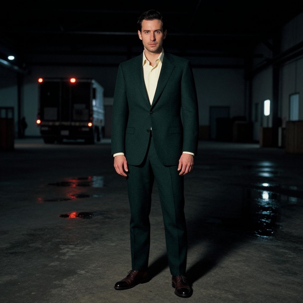 A man, dark green wool-blend suit, tailored silhouette, notch lapel blazer, slim-fit trousers, cream dress shirt, dark brown leather monk straps, standing in a dimly lit warehouse, puddles reflecting neon lights, AgfaColor film style, confident expression, distant sounds of cargo being unloaded. Man has masculine face and piercing eyes