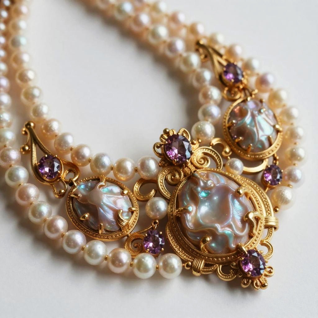 Close-up of rococo style jewelry with lavish pearl strings, swirling gold patterns, soft pink and blue sapphires, baroque-inspired design, glowing softly under warm light.