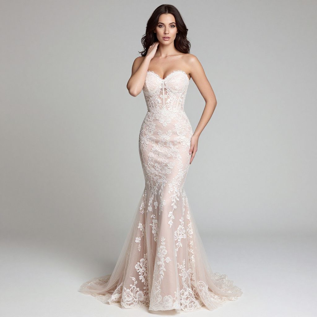 "Woman, romantic elegance, strapless mermaid gown in blush pink, overlay of white floral lace, sweetheart neckline, fitted bodice with transparent lace details, flaring out to a mermaid skirt from the knee, soft tulle train, posed with hand on neck, light grey studio background.. Sexy. Pretty face and beаutiful eyes. Big breasts."