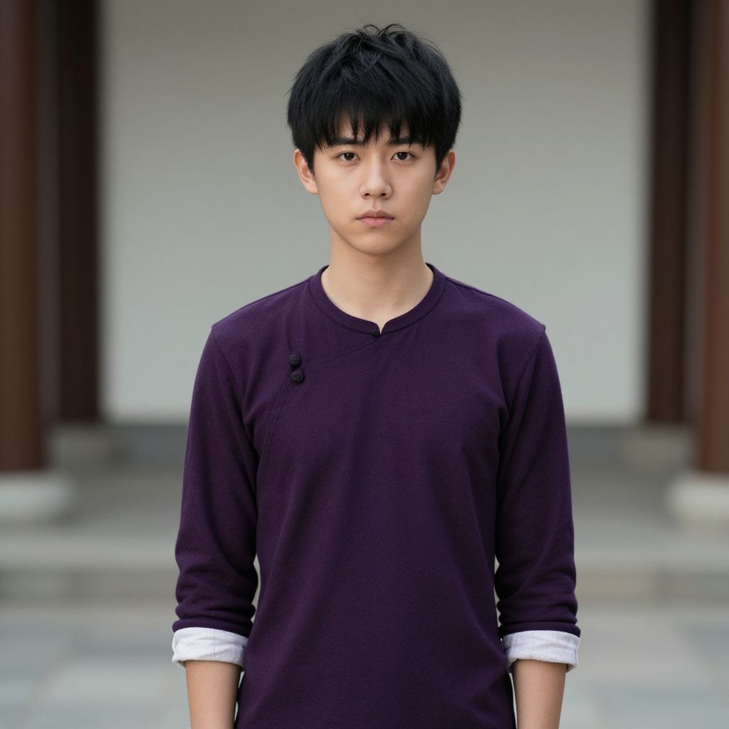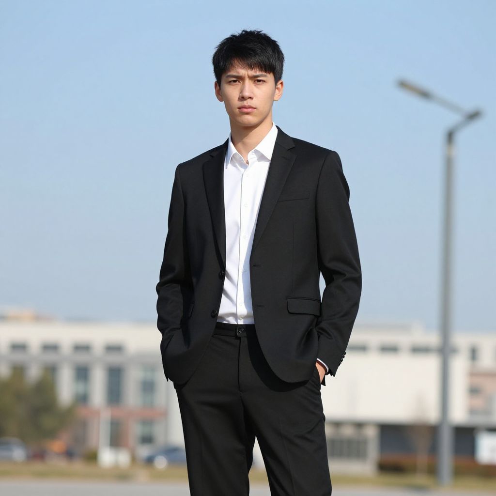 Photograph of an Asian man with short black hair, wearing a bright red double-breasted coat with black buttons and belt, standing against a plain gray