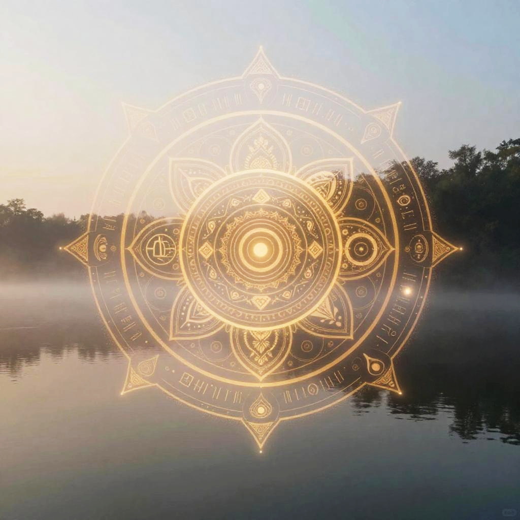 Digital artwork of a glowing, intricate mandala overlaying a misty lake at sunrise, with reflected trees and soft golden light.