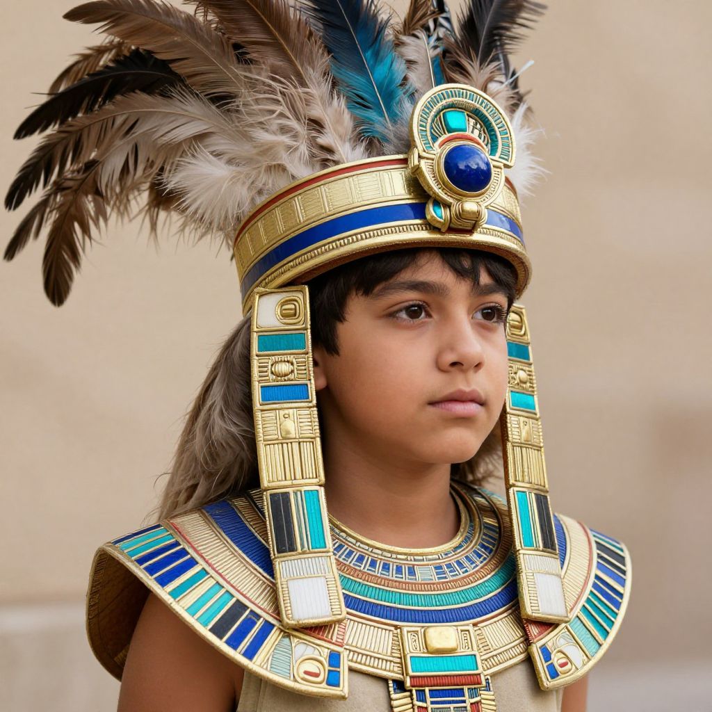 Aztec, a close up of a young boy wearing a costume with feathers
