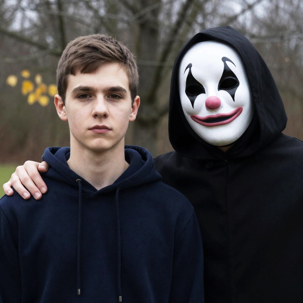 Photograph of two people outdoors. Young man with short brown hair, fair skin, and neutral expression on left. Person on right wears black hooded cloak with white, black, and pink clown mask, hand on young man's shoulder. Background: bare trees and yellow leaves.