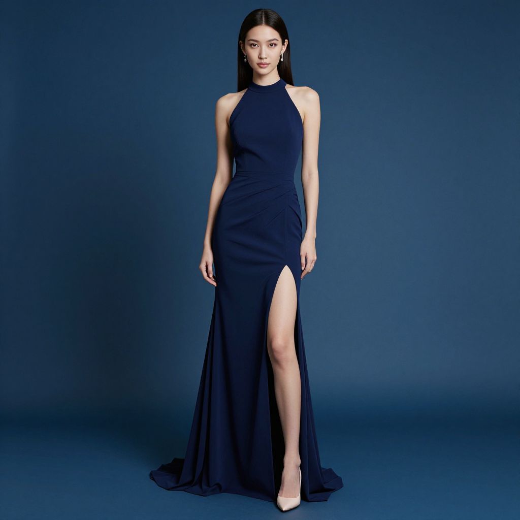 Photograph of a slender Asian woman with long black hair, wearing a sleek, navy blue, high-neck, halter dress with a thigh-high slit