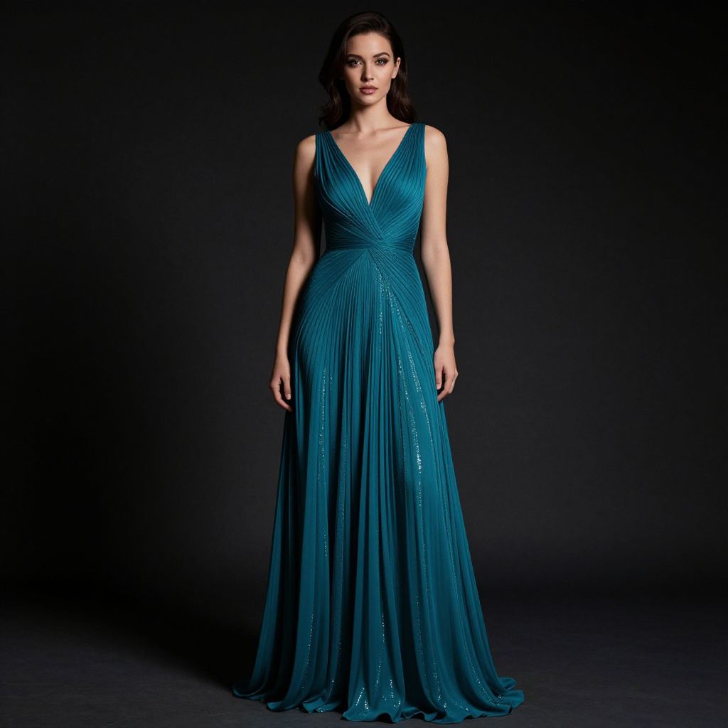 Portrait of a tall, slender woman wearing a navy blue sleeveless evening gown with a high neckline and thigh-high slit, standing against a matching dark blue background. The gown features a long, flowing train, complemented by simple earrings and nude high heels. The model has straight, sleek hair and a confident expression.