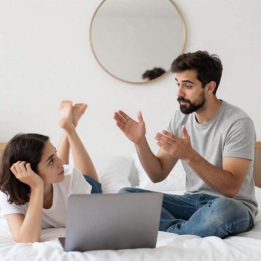 Photograph of a man with dark hair and beard, wearing a gray t-shirt, sitting on a bed, gesturing with his hands. A woman with dark hair, wearing a white t-shirt, lies on the bed with her legs raised, using a silver laptop. A round, gold-framed mirror hangs on the white wall behind them.