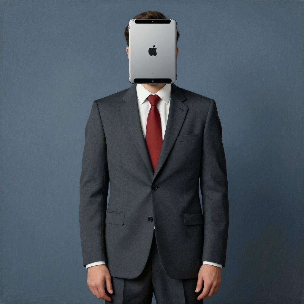 Photograph of a man in a black suit, white shirt, and red tie with an iPad instead of a head, against a solid blue background.