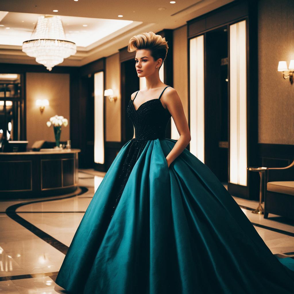 Pompadour Fade hairstyle on female model, wearing high-fashion evening gown, in luxury hotel lobby, captured in fashion editorial style with soft diffused light.