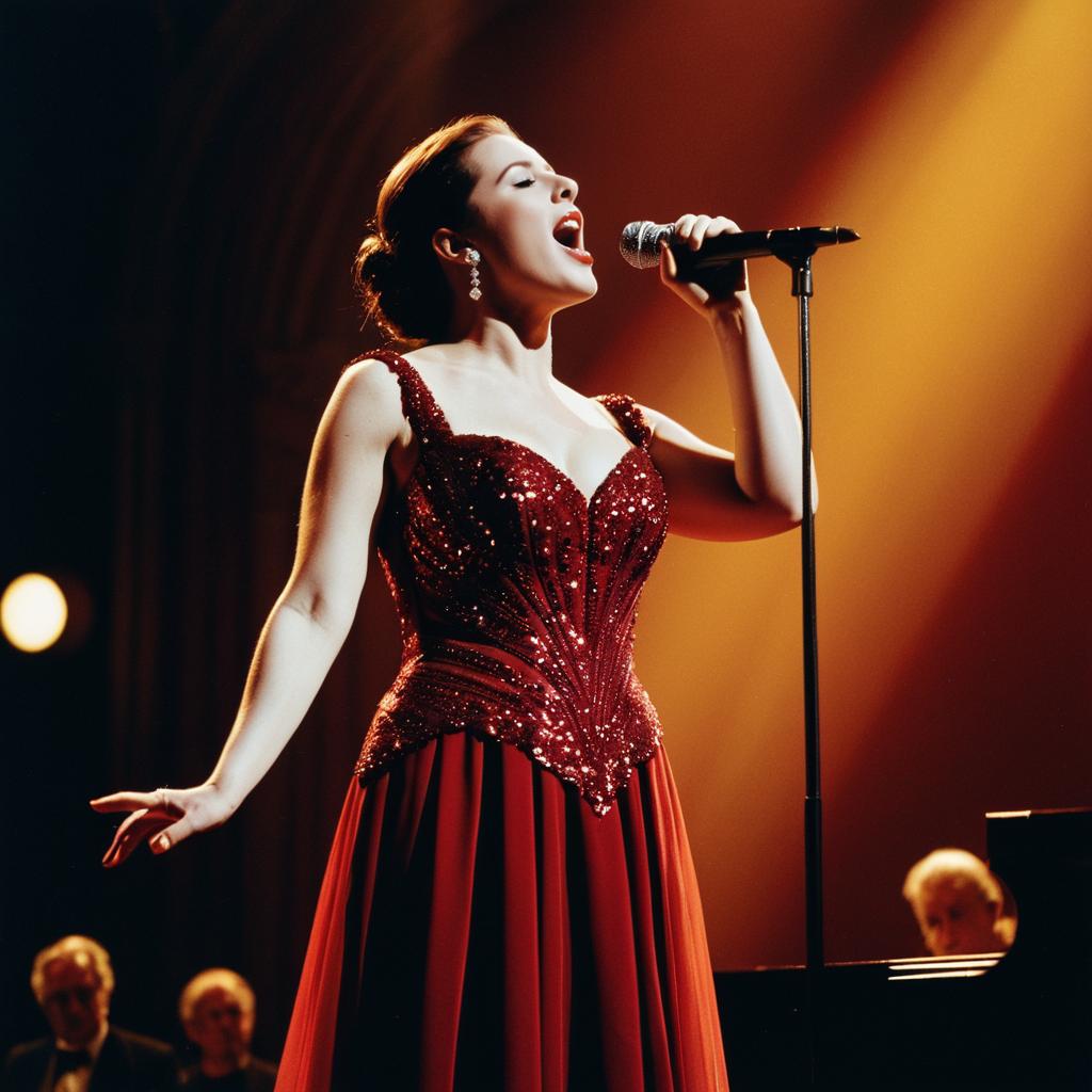 A female opera singer passionately performing a high note on a grand, historic stage. She is wearing an elegant crimson gown adorned with sequins that catches the stage light. The background features warm amber lighting creating strong chiaroscuro contrasts, highlighting the emotional and atmospheric mood. Musicians in formal attire are partially visible in the dim background.