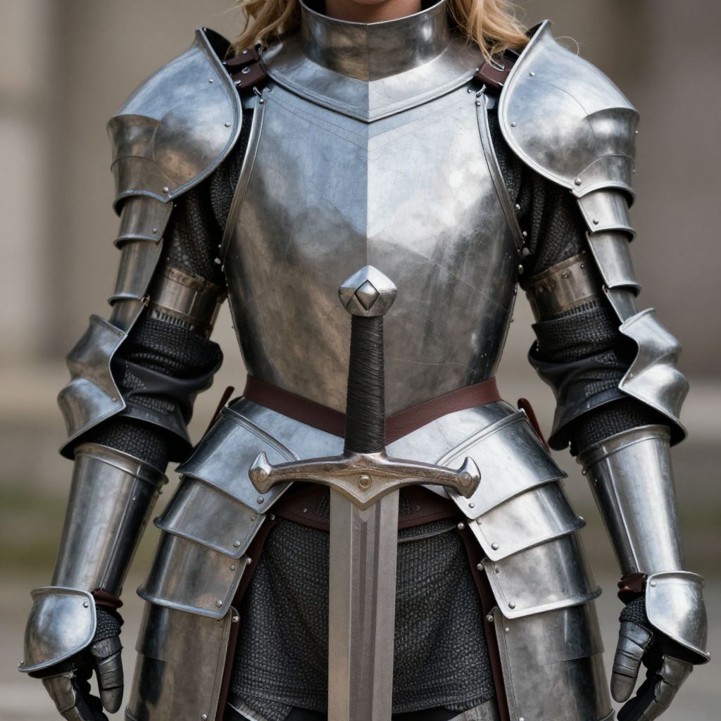 Photograph of a medieval knight in shiny, silver plate armor with black chainmail, visible sword, and blonde hair, standing outdoors.