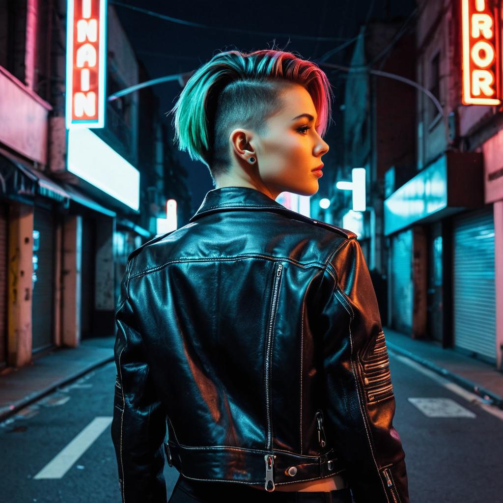 Nape Undercut hairstyle on fashion model, wearing leather biker jacket, in urban street corner, captured in fashion editorial style with dramatic neon lighting.