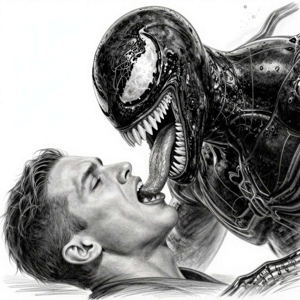 Monochromatic digital artwork of a terrified man with short hair being aggressively licked by a grotesque, black, Venom-like creature with sharp teeth and a