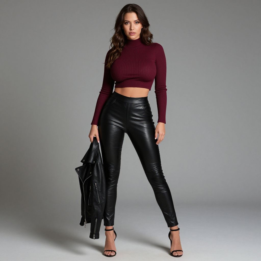 "Woman, edgy, burgundy ribbed crop top with high neckline, black faux leather leggings with knee stitching detail, strappy black high-heeled sandals, holding a black leather biker jacket with zipper accents.. Sexy. Pretty face and beаutiful eyes. Big breasts."