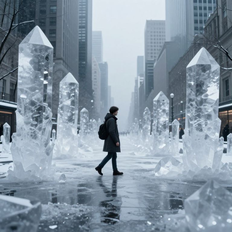 In a city square where time is suspended in crystalline forms, a solitary figure navigates the ethereal boundaries of memory and reality, their steps echoing the weight of transience amidst the frozen echoes of life’s fleeting moments.