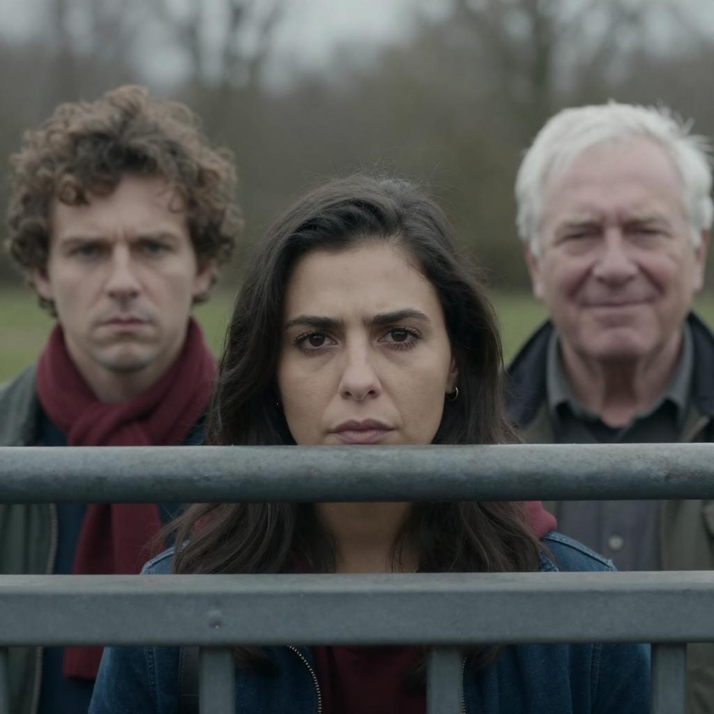 Black-and-white photograph of three people standing outdoors. Central figure is a woman with dark hair, sunglasses, and a shiny black leather jacket over a dark top. Two men in casual shirts stand behind her, slightly blurred. Background features trees and foliage. The woman's confident stance contrasts with the men's more relaxed postures.
