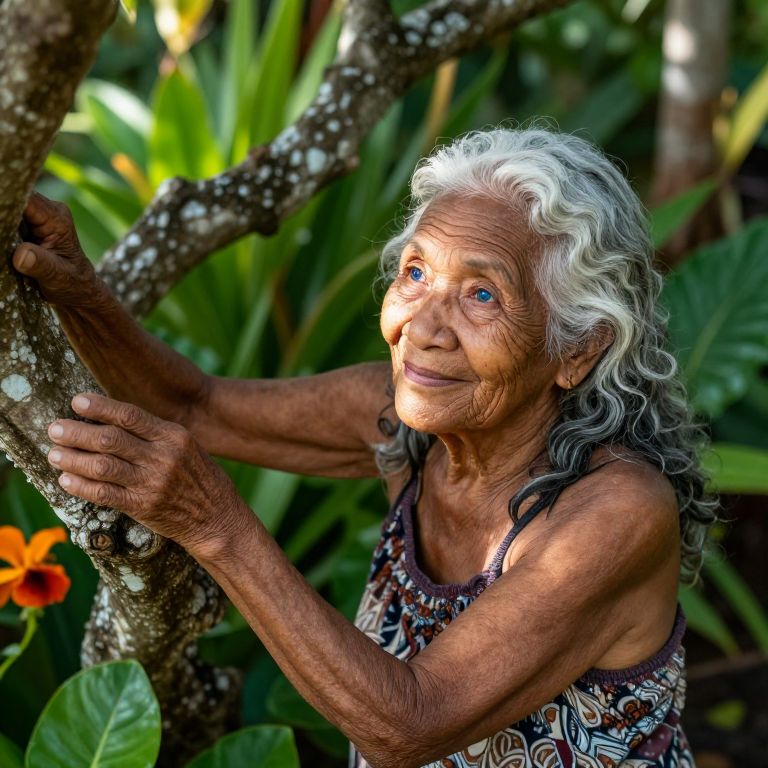 Craft an ultrarealistic portrait of a serene Pacific Islander elder with wavy silver locks framing her visage, tranquil blue eyes holding untold tales, and rugged wrinkles marking her old-school skin. From above, capture her amidst vibrant flora and lush greenery in a peaceful garden, soft sunlight illuminating her radiant smile as she tends to an ancient tree's gnarled branches that extend like welcoming arms. The interplay of light and shadow on her face accentuates her character's depth while the verdant backdrop seamlessly merges with the image, inviting introspection into her captivating presence.