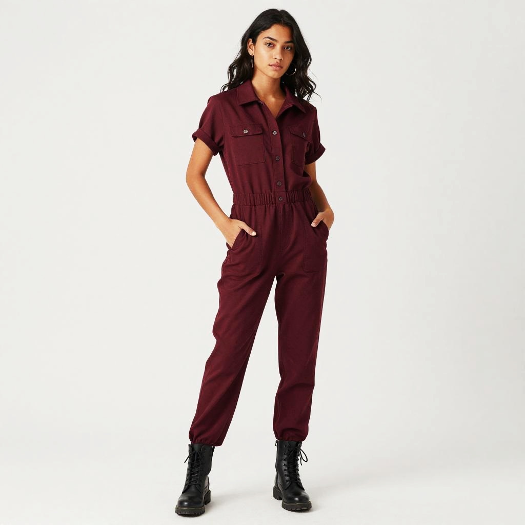 Photograph of a young woman standing against a white background. She has long, wavy black hair and is wearing a maroon, short-sleeved jumpsuit with buttons and pockets. Her hands are in the pockets of the jumpsuit, and she's wearing black lace-up boots. She has a confident, slightly serious expression. The overall style is casual-chic with a slightly edgy vibe.