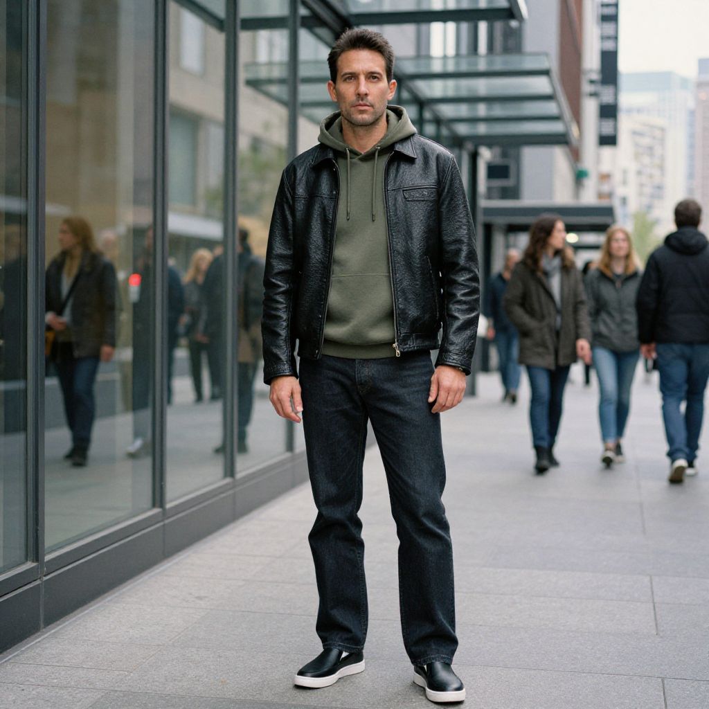 Photograph of a serious, medium-built man with short dark hair, wearing a black leather jacket, green hoodie, black jeans, and black sneakers,