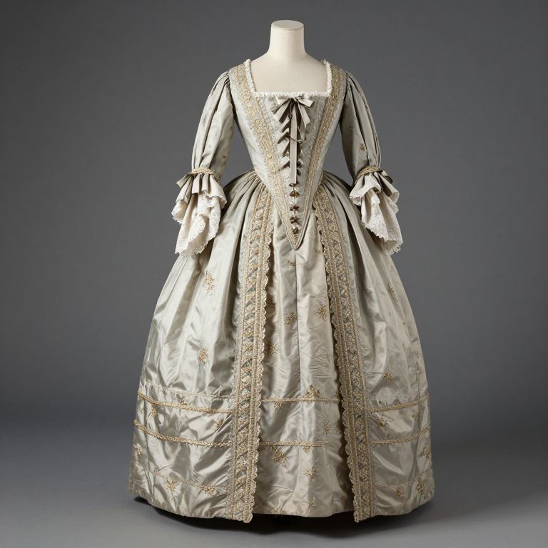 Photograph of an 18th-century, full-length, silver-gray satin dress displayed on a white mannequin. The dress features long sleeves with white ribbon cuffs, a V-shaped lace-trimmed front bodice with a small bow at the center, and intricate gold embroidery along the vertical seams and hem. The skirt is voluminous and flared, with additional gold embroidery at the bottom. The background is a solid, gradient blue-gray, highlighting the dress's elegant details and luxurious texture. The mannequin has no visible head or arms, focusing attention on the dress itself.