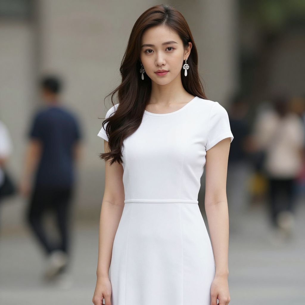 Simple ballroom dress, 1girl, solo, dress, white dress, blurry, realistic, blurry background, looking at viewer, flower, long hair, brown hair, earrings, jewelry, black hair